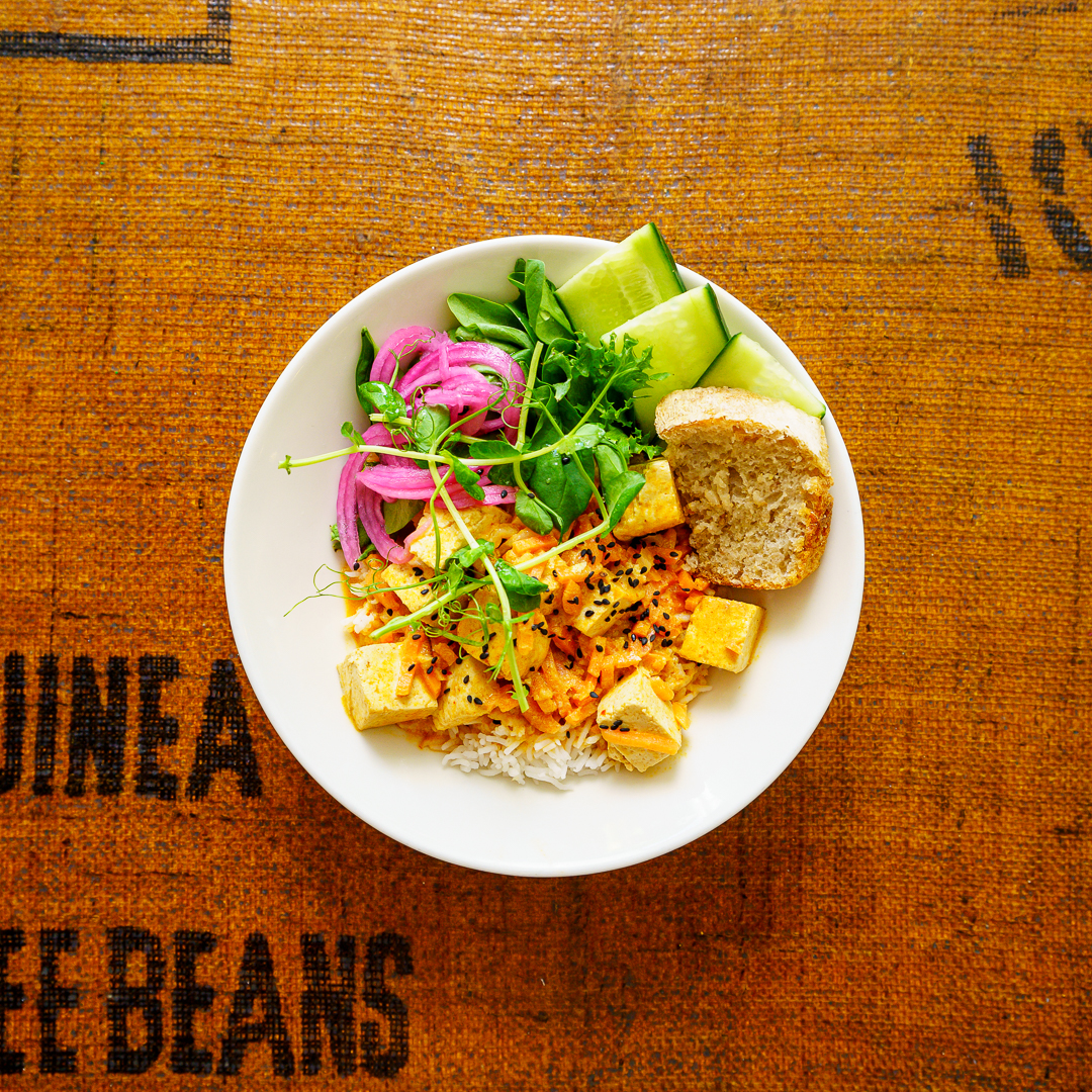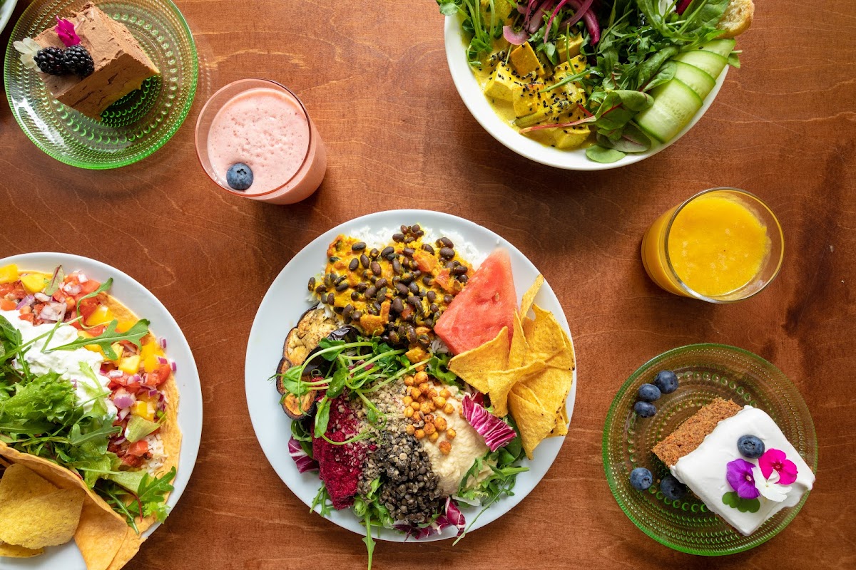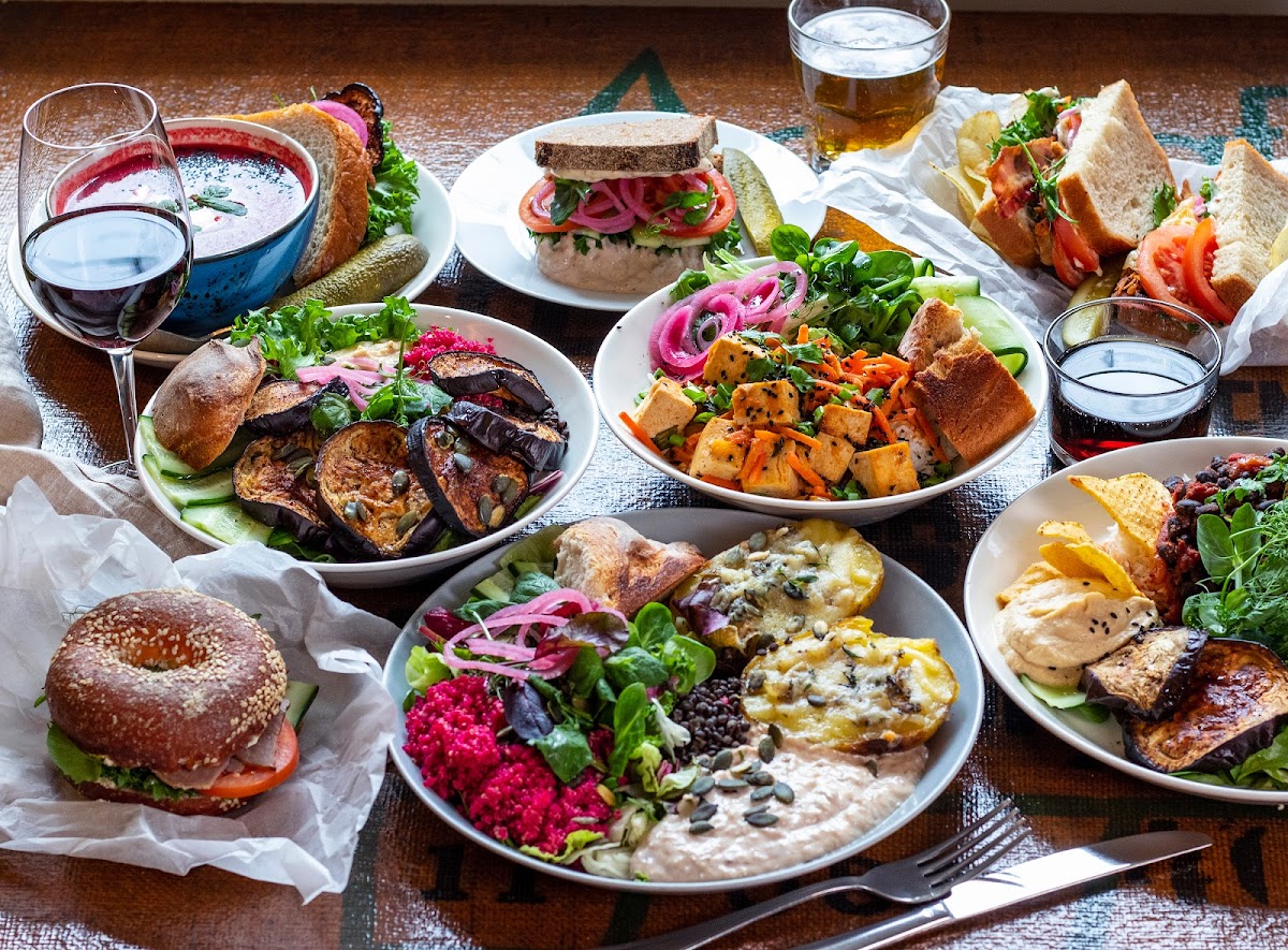 Lots of stuff like sandwiches, soups, salad, bowls, smoothies and cakes with vegan options. I have tried their lunches Tofu curry and the new 'Vegan Plate' (photo) which were both really good! Filling and full of flavour. Nice atmosphere and location - I hope they become fully vegan one day and don't charge +0,50 for plant milks!
